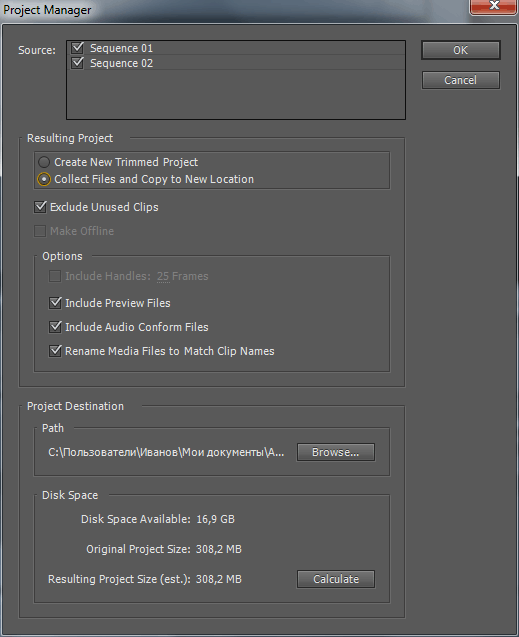 В программе Adobe Premiere Pro есть штатная функция сборки проекта и файлов использованных в нем в одном месте, например на внешнем носителе, для того чтобы перенести проект на другую рабочую станцию. Функция называется Project Manager (Диспетчер проектов) и для доступа к ней выполняем команду: Project > Project Manager (Файл > Диспетчер проектов). Загрузится окно Project Manager (Диспетчер проектов), где в разделе Source есть возможность выбрать какие последовательности будут переноситься в копию проекта. Дальше в разделе Resulting Project (Итоговый проект) выбираем из двух основных типов переноса проекта: