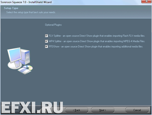 Squeeze 7 работает как native plugins для приложений: Avid, Apple Final Cut Pro и Adobe Premiere (CS4, CS5). Вот эту последнюю возможность мы и проверим. Запускаем установку кодера Sorenson Squeeze 7. В разделе: Optional Plugins не будет доступен выбор плагинов для видеоредакторов.