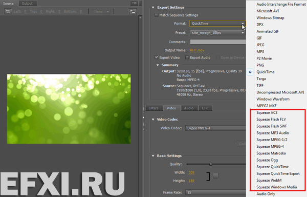 Далее, в окне Export Settings выбираем Format: Squeeze.