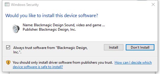 В появившемся окне Windows Security, разрешаем устанавливать программное обеспечение Blackmagic Design, Inc, нажав на кнопку: Install.