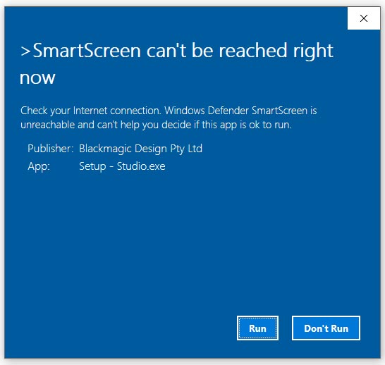 В окне с сообщением SmartScreen can't be reached right now, нажимаем на кнопку: Run.
