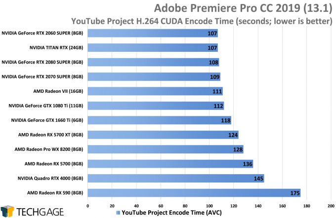Тесты с сайта Puget Systems, бенчмарк Puget Systems Premiere Pro Benchmark "4K Heavy GPU Effects" был запущен на версии программы Adobe Premiere Pro CC 2019 (v13.1.4).