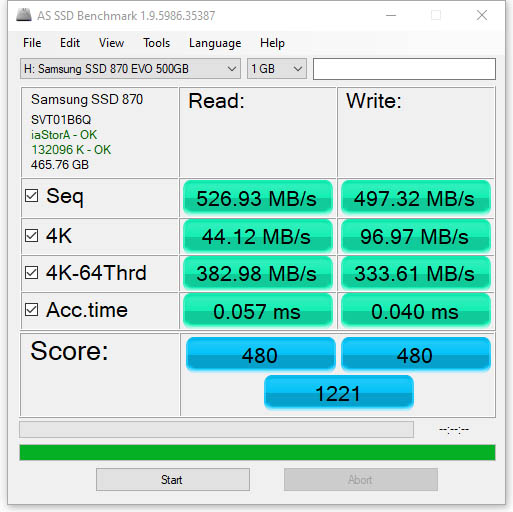 Тестирование скорости с помощью утилиты AS SSD Benchmark 1.9.5986.35387. Смотрим на версию драйвера: iaStorA - OK.