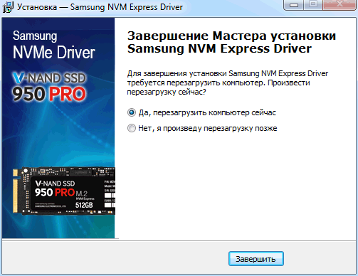 Для завершения установки Samsung NVM Express Driver требуется перезагрузить компьютер. Нажимаем на кнопку: Завершить.