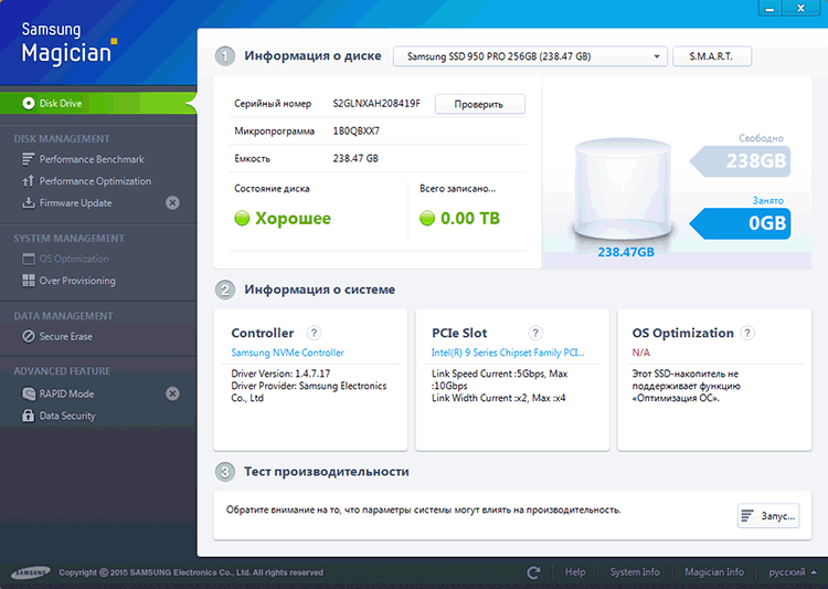 Запускаем программу Samsung Magician и смотрим информацию о диске.