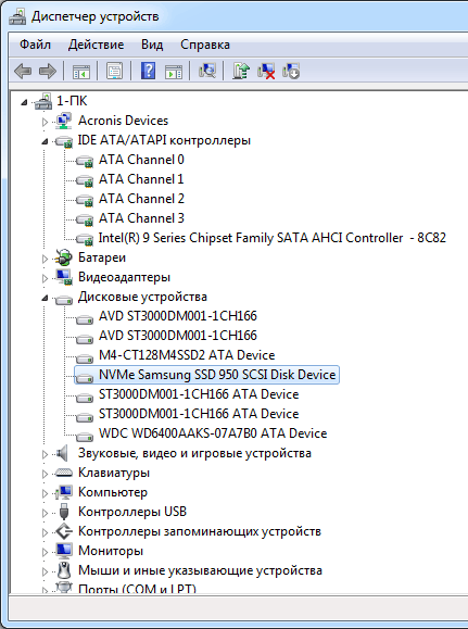 В Диспетчере устройств, в разделе Дисковые устройства, видим: NVMe Samsung SSD 950 SCSI Disk Device.