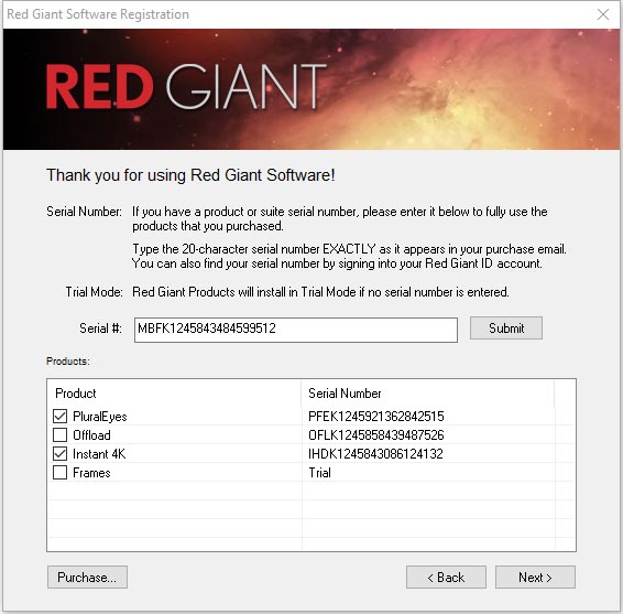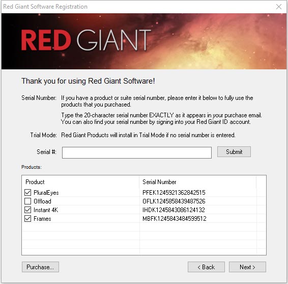 Загрузится окно регистрации Red Giant Software Registration. Куда мы будем вбивать следующие серийные номера: