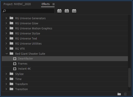 Запускаем программу Adobe Premiere Pro CC 2020. И проверяем наличие плагинов из набора Red Giant Shooter Suite 13 в следующей директории: Эффекты > Видеоэффекты > Red Giant Shooter Suite (Effects > Video Effects > Red Giant Shooter Suite).