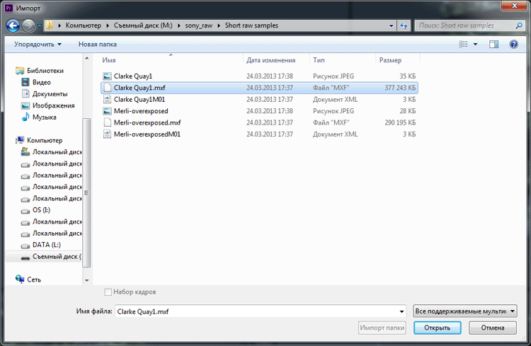 Итак, в программе Adobe Premiere Pro CC 2015.2 нажимаем комбинацию Ctrl+I, выбираем Sony RAW видео в контейнере .mxf и нажимаем на кнопку: Открыть.