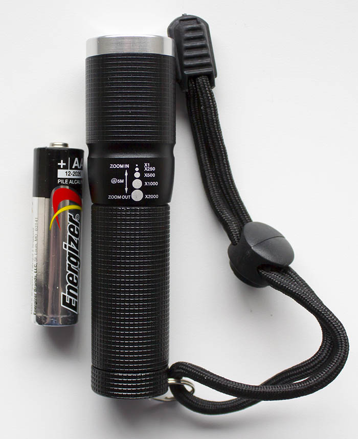 Длина фонаря составляет: 95 мм. Фото с рядом лежащей батерейкой АА. В комплекте идет бюджетный шнурок с клипсой.