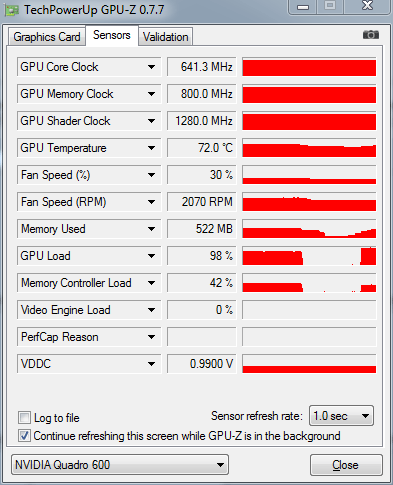 Загрузка GPU профессионального видеоускорителя PNY VCQ600ATXV2-T построенной на чипсете nVidia Quadro 600 при финальном рендеринге таймлайна: 97%, количество используемой бортовой памяти: 533 Мбайта. Видеокарта работала на штатных частотах.