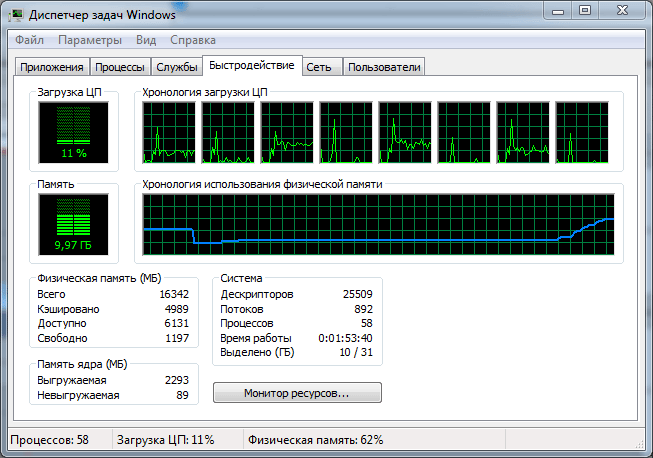 Загрузка центрального процессора (CPU) всего 11% и 9.97 Гбайт оперативной памяти (RAM) DDR3-1600.