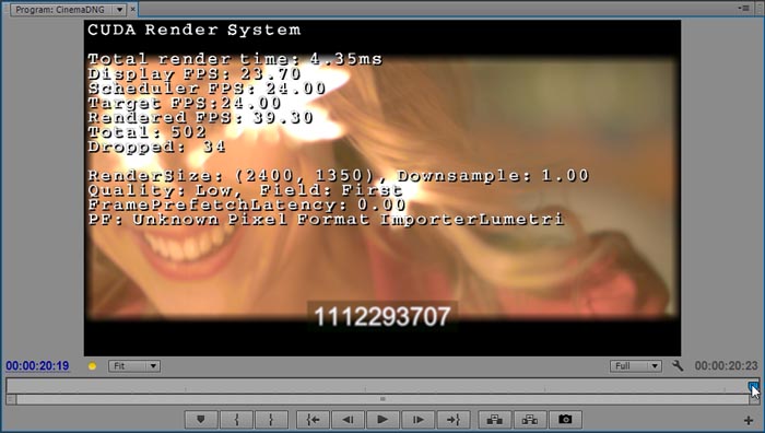 CUDA Render System, при предварительном просмотре получили 34 пропущеных кадров (Frames Dropped During Playback). Превью таймлайна: CUDA Render System, Total render time: 4.35 ms. Display FPS: 23.70. Scheduler FPS: 24.00. Target FPS: 24.00. Rendered FPS: 39.30. Total: 503 кадра. Dropped / пропущено кадров: 34. Quality: Low. FramePrefetchLatency: 0.00. PF: Unknown Pixel Format ImporterLumetri.