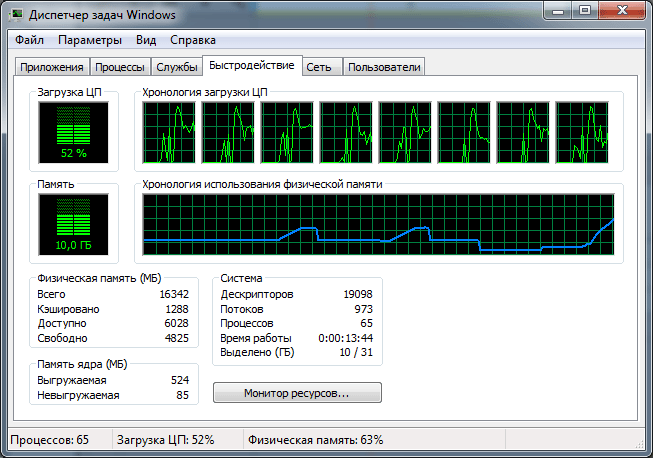 Загрузка центрального процессора Intel Core i7-3770 (Ivy Bridge, работающего на частоте 3.4ГГц) при превью: 52% и утилизировано ровно 10 Гбайт оперативной памяти (RAM).