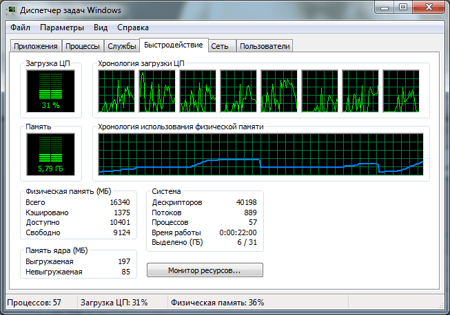 Загрузка центрального процессора (CPU) при предварительном просмотре линейки времени: 31%, задействовано 5.79 Гбайта памяти DDR3-1600.