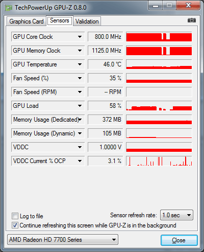 Загрузка GPU AMD Radeon HD 7750 видеокарты Power Color AX7750 1GBD5-DH: до 100% (график загрузки ровный), использование бортовой видеопамяти: 372 Мбайта.