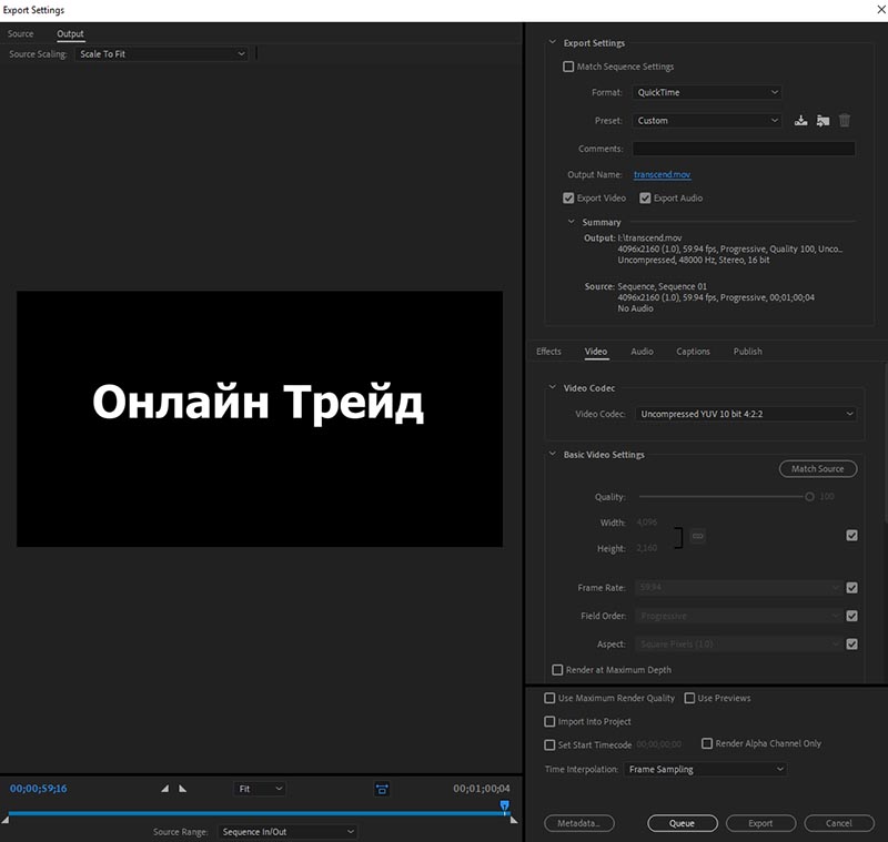 Начинаем экспорт видео, в настройках экспорта был выбиран формат QuickTime, видеокодек: Без сжатия YUV 10-битный 4:2:2, атрибуты исходного файла и выбираем накопитель Transcend MTE110S (TS256GMTE110S) в настройках — Имя выходного файла.