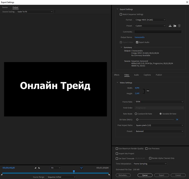 Выбираем в настройках экспорта формат: Cinegy HEVC (H.265).