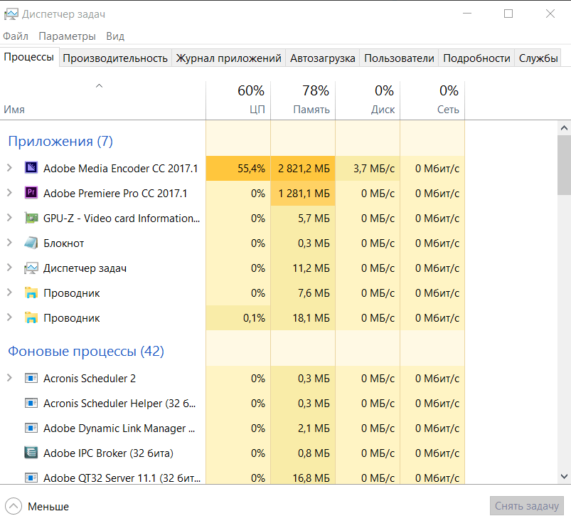 Процесс Adobe Media Encoder.exe грузит центральный процессор на 57.3%, и утилизирует 2.66Гбайт оперативной памяти DDR3-1600.