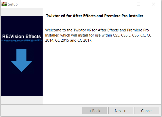 В окне Setup, узнаем информацию, что плагин версии Twixtor 6.2.8, подходит для всех 64-битных версий программы Adobe Premiere Pro, от CS5 до CC 2017 (включительно). Нажимаем на кнопку: Next >