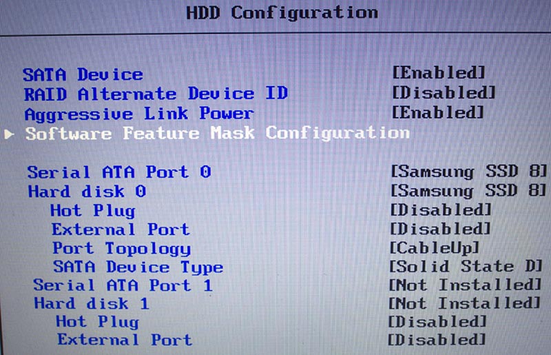 Exit > Platform Advanced > HDD Configuration. Страница содержит следующие пункты: SATA Device (Enabled), RAID Alternative Device ID (Disabled), Aggressive Link Power (Enabled), Serial ATA Port 0 (Samsung SSD 870 EVO), Hard disk 0 (Samsung SSD 870 EVO), .