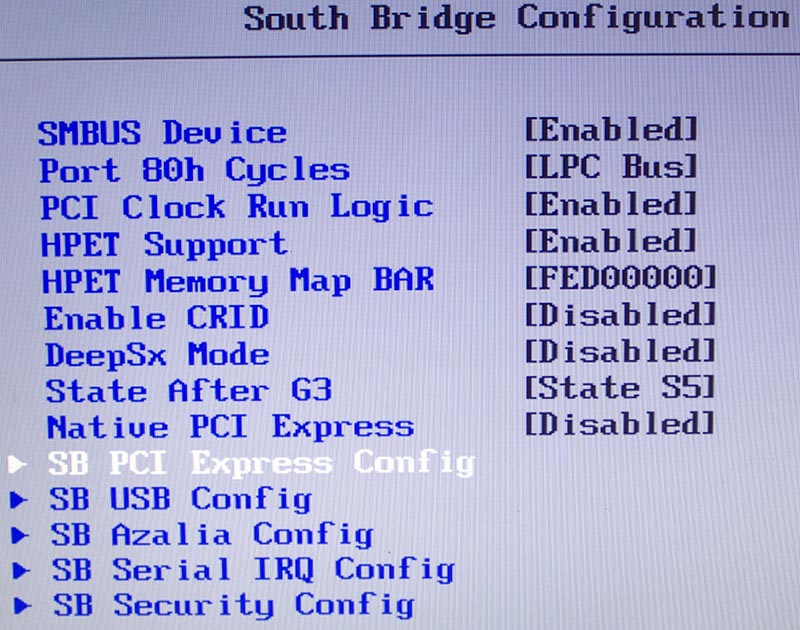 Exit > Platform Advanced > South Bridge Configuration > SB PCI Express Config. Страница содержит следующие пункты: .