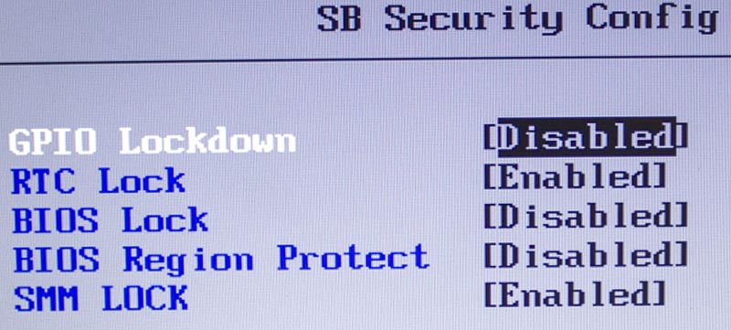 Exit > Platform Advanced > South Bridge Configuration > SB Security Config. Страница содержит пять пунктов: GPIO Lockdown (Disabled), RTC Lock (Enabled), BIOS Lock (Disabled), BIOS Region Protect (Disabled), SMM LOCK (Enabled).