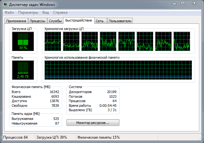 Загрузка центрального процессора Intel Core i7-3770 (все восемь потоков активны): 39% и 2.4 Гбайта оперативной памяти (RAM).