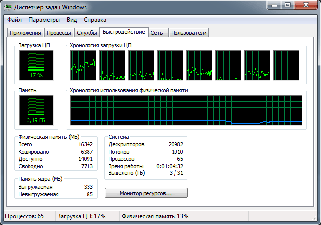 Загрузка четырехъядерного процессора Intel Core i7-3770 (Ivy Bridge) третьего поколения, работающего на номинальной частоте 3.4ГГц составила 21%, а RAM (оперативной памяти) 2.41 Гбайт.