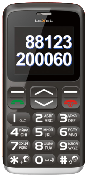 Для комфортной работы с мобильным телефоном teXet пользователей всех возрастов в основном меню и экране набора реализован крупный хорошо-читабельный шрифт, а большие кнопки с четким нажатием исключают возможность ошибочного набора номера или сообщения. Контрастного дисплея с диагональю 2 дюйма вполне достаточно для четкого отображения информации, так что люди с ослабленным зрением смогут пользоваться устройством даже без очков.