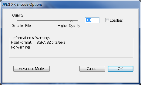 В фотошопе выполняем команду: File > Save As и в меню выбираем тип файла: JPEG XR (*.JXR). При нажатии кнопки Advance Mode появится дополнительное меню с настройками:
