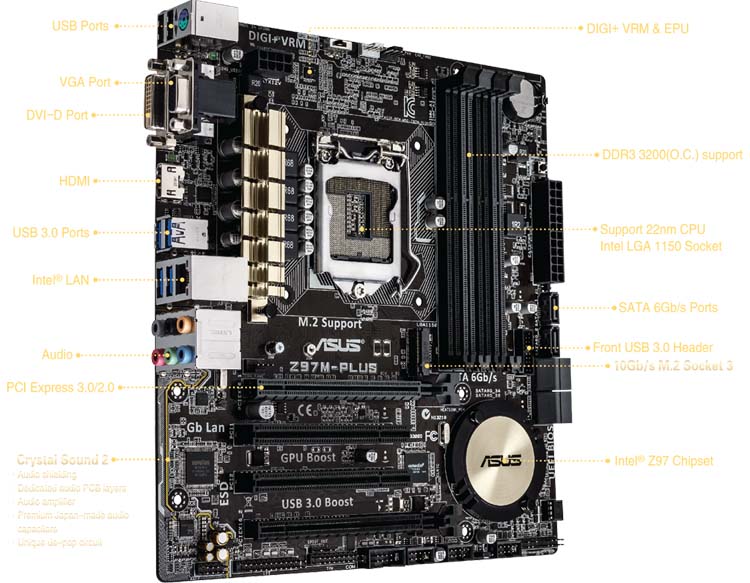 ASUS Z97M-PLUS это одна из самых дешевых системных плат построенных на чипсете Intel Z97 Express с интерфейсами M.2 но без поддержки SLI.