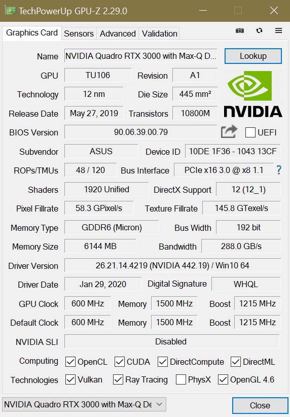 Новая профессиональная видеокарта Quadro RTX 3000 Mobile от компании NVIDIA построеная на чипсете TU106 (Turing). Она имеет игровой аналог: NVIDIA GeForce RTX 2060 Mobile.